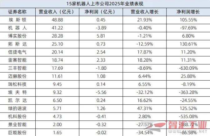 目前,A股上市公司年報(bào)已陸續(xù)披露。據(jù)同花順iFinD數(shù)據(jù),申萬(wàn)行業(yè)機(jī)器人分類(lèi)有20家上市公司,從已披露業(yè)績(jī)的15家公司來(lái)看,整體喜憂(yōu)參半:營(yíng)業(yè)收入有8家增長(zhǎng)7家下滑,凈利潤(rùn)7家增長(zhǎng)8家下滑,同時(shí)有6家公司出現(xiàn)虧損。